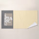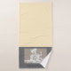 The Towel features a calm, sand-like design in warm beige and natural tones, reminiscent of fine beach or desert sand. A subtle artistic illustration is printed: a young woman sitting cross-legged in a classic yoga pose.