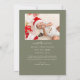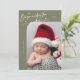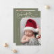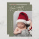 Elegante y moderna carta de anuncios de Navidades temáticos con un texto escrito a mano que dice "Nacido bajo el mistletoe". ¡Esta es una tarjeta de anuncio de nacimiento para las fiestas! ¡Añade tus fotos, estadísticas de nacimiento y un mensaje! El fondo es verde salvia.