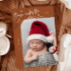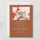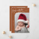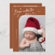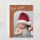 Elegante y moderna carta de anuncios de Navidades temáticos con un texto escrito a mano que dice "Nacido bajo el mistletoe". ¡Esta es una tarjeta de anuncio de nacimiento para las fiestas! ¡Añade tus fotos, estadísticas de nacimiento y un mensaje! El fondo es terracota.