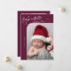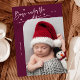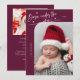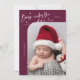 Elegante y moderna carta de anuncios de Navidades temáticos con un texto escrito a mano que dice "Nacido bajo el mistletoe". ¡Esta es una tarjeta de anuncio de nacimiento para las fiestas! ¡Añade tus fotos, estadísticas de nacimiento y un mensaje! El fondo es arándano.
