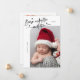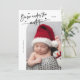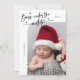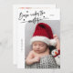Elegante y moderna carta de anuncios de Navidades temáticos con un texto escrito a mano que dice "Nacido bajo el mistletoe". ¡Esta es una tarjeta de anuncio de nacimiento para las fiestas! ¡Añade tus fotos, estadísticas de nacimiento y un mensaje! El fondo es blanco.