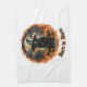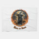 Una toalla de cocina o una toalla de té, de diseño intenso y lleno de fuego, con una bruja gótica en un gorra puntiagudo, rodeado de lámparas de jack-o'. La obra de arte está rodeada por un anillo de fuego dramático, con el atrevido texto 'Nacido para quemar' debajo. Este potente ilustracion de temporada es ideal para decorar su cocina durante Halloween