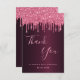 Una tarjeta de agradecimiento por un cumpleaños número 50 (o cualquier edad). Un color de fondo burdeos de aspecto metálico profundo. Con goteos en purpurina de imitación rosada, pinturas que gotean. Delante de una gran escritura con letras a mano y el texto: Gracias, tu texto, título y una fecha. Parte posterior: plantilla para su nota de agradecimiento y nombre.