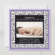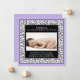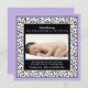 El texto y la foto del bebé de esta moda bebé lavanda el anuncio del nacimiento de la foto del damasco con flores morado, negro y blanco son totalmente personalizables. Para cambiar el texto y la foto, utilice las opciones de personalización. Para realizar cambios más extensos en la invitación, incluyendo cambios en el tipo de letra, el color del tipo de letra, el tamaño del tipo de letra, el tamaño de la foto y/o la ubicación de texto/foto, utilice la opción personalizar. Los colores de este retro anuncio floral de nacimiento son negro, blanco y púrpura lavanda. Se vería genial con una foto de bebé en blanco y negro también.