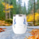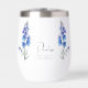 Flor de mes de nacimiento Julio Tubo de Larkspur con un ilustracion de una flor de larkspur. Debajo de la flor, el nombre está escrito en una elegante fuente de escritura. Debajo del nombre, se indica "Julio - Larkspur", que indica que el mes de nacimiento de la dueña es julio y que su flor de nacimiento es el larkspur. Es un vaso de vino personalizado, creado como un regalo para alguien nacido en julio.