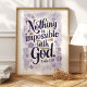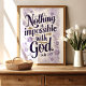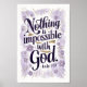 Abraza el poder de la fe con esta hermosa impresión de arte tipográfico que presenta el versículo inspirador de Lucas 1:37. La elegante escritura en púrpura profundo, adornada con delicadas flores de acuarela en tonos de lavanda y oro, crea un diseño sereno y edificante. Perfecto para agregar un toque de inspiración espiritual a la decoración de tu hogar o oficina.