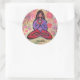 Una chica de yoga de cabello marrón se sienta en gratitud con una flor en las manos. Miren a este pegatina y díganse: "Aliento el universo y el universo me nutre". Namaste.