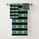 Una decoración moderna en tonos azules, naranjas y amarillos. Bordes decorativos, formas simples. Simetría y repetición.