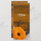 El encantador Naranja Daisy y Horseshoe Country Wedding Menu se puede personalizar con los detalles de la comida que se sirven en el almuerzo de su ducha de novia informal pero elegante, fiesta de granero de compromiso o cena de la recepción matrimonial añadiendo la ensalada o el primer curso, el segundo y el postre o tercer curso. La carta de este boda rústico personalizado de moda equino occidental presenta una pintoresca fotografía floral de una flor de margarita gerber naranja, una herradura oxidado y un velo nupcial blanco con fondo de granero marrón.