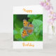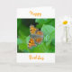 Mariposa de rango medio sentada en hojas verdes, naranja Texto: "Feliz cumpleaños"