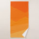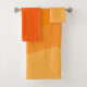 Este juego de toallas incluye un paño de lavabo naranja claro, una toalla de mano naranja oscura y una toalla de baño con un diseño geométrico de cuatro tonos de naranja que se desplazan horizontalmente.