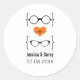 Pegatinas de bodas de gafas geky y moda con un corazón naranja flanqueado por dos pares de anteojos geky, una pareja masculina y una pareja de niñas que representan al novio y la novia. ¡Estos pegatinas extravagantes pero sofisticados son perfectos para tu boda nerd! Fácil de personalizar, simplemente agregue los detalles de su gran día en los campos de texto proporcionados. Haga clic en el botón "Personalizar" para encontrar opciones de personalización adicionales.