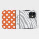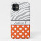 funda personalizado para iPhone 5 personalizado con su nombre, y diseñado con un patrón de puntos de polka naranja y blanco y un patrón de impresión de cebra descolorida con rayas de cebra grises y blancas.