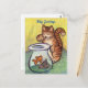 Palabra en la nota de la tarjeta "Kitty Greetings" (Saludos a Kitty) pero se puede cambiar para hacer su propio mensaje de tarjeta de felicitación personalizado. El arte cuenta con un gato de tabby naranja con una pata elevada sobre un bol de peces dorados. ¡Haz tus propios regalos de amante de los gatos personalizados con mensajes personalizados!