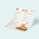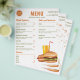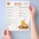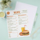 Diseño de una plantilla de lista de precios de menú de comida para un restaurante o un vendedor ambulante de comida con el ilustracion de Destei de comida rápida que incluye una bebida naranja con paja roja, un perro caliente con ketchup y mostaza encima y una hamburguesa con un bollo de semillas de sésamo lleno de queso, lechuga, carne, tomate, ketchup y pepinillos. Hay varias áreas de texto personalizables para listar diferentes tipos de comidas y otras opciones de menú. En la parte superior hay incluso un sitio para un logo personalizado. Personalice este diseño para que se ajuste a las necesidades de su empresa.
