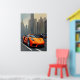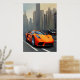 Naranjas de coches deportivos conduciendo por una carretera con una ciudad al fondo. Este es un arte generado por IA.