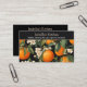 Una elegante tarjeta de visita para un servicio de restauración móvil, con un ilustracion de hojas verdes, frutas y flores de flores blancas de un árbol naranja. Los cítricos brillantes dan un aire fresco al verano, perfecto para atraer a los clientes que tienen fiestas en el jardín y otros eventos al aire libre. Personalice su nombre de negocio, su etiqueta y los detalles de contacto.