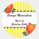 Un pegatina personalizado con una cocina vintage, arte creativo de naranjas con flores pequeñas y espacio para tu receta y nombre en letras de escritura marrón oscuro en un patrón de guisante de gingham amarillo. Personalizar Para agregar o restar texto, cambiar el estilo de las letras, los colores de fondo, la forma pegatina, incluso guardar la etiqueta de la bandeja de personalizado para más adelante.