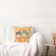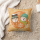 La almohada de vacaciones Dots y Snowflakes Naranja Dots, tan bonito y colorida, presenta copos blancos de nieve en un fondo rosado con un círculo naranja con puntos blancos y cada lado tiene una pareja de hombres de nieve sonriente con un gorra, bufanda, nariz de zanahoria y copos de nieve.