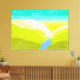 Original pintura acrílica digital horizontal de hermosas colinas verdes brillantes y un valle de río azul entre ellas con un brillante cielo turquesa y puesta de sol o amanecer. Escena positiva de la naturaleza optimista. Perfecto como regalo o siéntete añadiendo este bonito cuadro a tu espacio. Una imagen inspiradora para ayudarle a encontrar energía para sus tareas diarias. La obra de arte es una auténtica reproducción de la pintura digital original del artista: arte del copyright ©Natasa Borenovic, abril de 2022