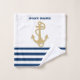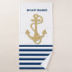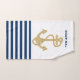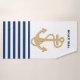 Esta imagen muestra el nombre de un barco, y el ancla sobre un fondo de rayas azul marino y blanco.