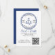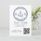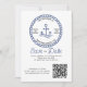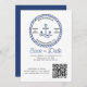 Boda moderna Salve la fecha con código QR y tema náutico. Guarda la tarjeta de invitación de fecha con la fecha y la ubicación de su boda, establecida en un logotipo de tema del barco en azul y blanco tradicionales. La plantilla está configurada para que agregue su texto y la dirección URL del sitio web boda para el código qr. Perfecto para el capitán del barco, el boda marítimo, la boda de destino, los aficionados a la vela y a los cruceros.