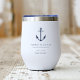 Estos tumblers de moda costera hacen grandes regalos de novias náuticas o favores matrimoniales para tu boda de New England, Maine, Nantucket o yacht club. El diseño minimalista limpio incluye sus nombres, fecha de boda y ubicación en letras clásicas de serif azul marino. Un ilustracion de ancla náutica azul marino completa el diseño.