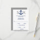 Una carta de invitación a la boda con temática náutica en gris y marina. Un ancla está en la parte superior de la invitación, con las iniciales de la novia y el novio a ambos lados. En la parte inferior hay un diseño de cuerda trenzada de color gris. La parte posterior es un gris sólido con un ancla marina en la esquina. Visita mi tienda para ver artículos bodas coincidentes y otras combinaciones de colores.