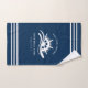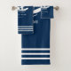 Este juego de toallas de baño azul marino y blanco incluye una estilizada rueda de barco y olas oceánicas, con rayas horizontales. Las plantillas de texto personalizado "Welcome Aboard" con el nombre y el registro del barco facilitan la personalizar rápida de las toallas para un regalo único o una decoración costera única. Consulte la colección para ver los productos coincidentes. Si quieres otras colorantes o más productos a juego, por favor contacta conmigo a través de Zazzle Chat.