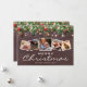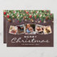 Tarjetas de Navidad elegantes de estilo campestre con fondo de madera oscura rústica, ramas de árbol de Navidad festivas, adornos de árbol rojos y dorados, luces de hadas, 5 fotos familiares, saludos de temporada, su nombre y el año