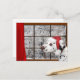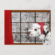 El perro dálmata lleva un gorra de Santa y considera hacia fuera la ventana el navidad que espera de la nieve para y la observación para la tarjeta de felicitación del día de fiesta del navidad de los amantes del perro de Santa