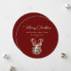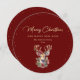 Elegante tarjeta roja y dorada Feliz Navidad con un saludo de vacaciones con letras doradas y un ciervo acuarela sobre un fondo rojo adornado con nieve dorada. Personaliza fácilmente esta tarjeta de vacaciones roja y dorada con tu nombre familiar y un mensaje. El efecto Relieve metalizado dorado sólo se simula en las obras de arte.