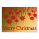 Un saludo de Navidades dorados, con un rastro de decoraciones navideñas rojas y estrellas colgando del mensaje Feliz Navidad.