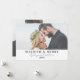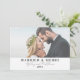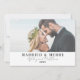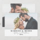 Celebre su primera Navidad como pareja casada compartiendo su alegría con seres queridos a través de esta tarjeta simple y minimalista. Con la frase "Casados y alegres" en la parte frontal, el diseño incluye sus nombres y año de bodas, lo que la convierte en una forma perfecta de conmemorar su año especial. La tarjeta muestra dos de sus fotos favoritas, ya sean de su día de bodas u otros momentos preciados juntos, con una transparencia blanca sutil para un efecto etéreo. Puede eliminar fácilmente la transparencia en el editor completo si prefiere una apariencia más brillante. Esta tarjeta es una hermosa forma de enviar cálidos deseos navideños mientras celebra su amor. Tarjeta de Navidad para recién casados, Casados y Alegres, Simple y Elegante con Foto.