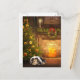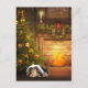 El collie miente delante del árbol de navidad y acerca a una postal ardiente del día de fiesta del amante del perro del fuego de la chimenea
