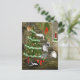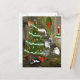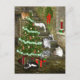 Los gatos múltiples cuelgan alrededor un árbol de navidad en la moda típica del gato, 2 tabbies de plata, un tabby anaranjado, blanco y negro, blanco, de largo y postal de pelo corto del día de fiesta de los amantes del gato