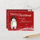 Dibujo animado de mirada divertido escarchado el muñeco de nieve en un fondo nevoso rojo. Navidad muy lindo y diversión que saluda la postal.