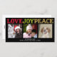 Comparta sus fotos de familia preferidas en esta tarjeta de felicitación elegante del navidad. El saludo colorido "paz de la alegría del amor" se fija en tipografía inesperada del woodblock. Este diseño acomoda 3 fotos con su texto de encargo en la parte inferior.