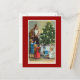 Tarjeta de Navidad alemana del vintage clásico que muestra a Papá Noel que entrega los regalos a tres pequeños niños. El árbol de navidad iluminado por velas hermoso encantan a los niños.