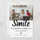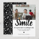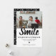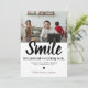 Tarjeta de felicitación de Navidad divertida 2021 con un simple fondo blanco que se puede cambiar a cualquier color, una preciosa foto familiar, el dicho humorístico "sonríe, fingamos que todo está bien", sus saludos de temporada, y nombres.