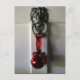 El timbre de la cabeza de Lion, de color cálido, en una puerta blanca con una campana de canto rojo sobre una cinta de Navidades, te invita a cenar, a fiestas y a festividades familiares.