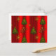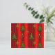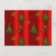 Una tarjeta postal de Navidad muy decorativa que presenta un patrón de árboles de Navidad tradicionales y copos de nieve dorados sobre un fondo rojo muy festivo. También está el texto 'Noel' en un aspecto metálico dorado muy decorativo.
