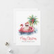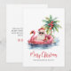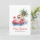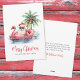 Adéntrate en el espíritu navideño con esta tarjeta de Navidad única que presenta a un relajado Santa Claus con gafas de sol descansando en un flotador de flamenco rosa en el océano. Perfecta para enviar deseos navideños playeros, esta tarjeta es ideal para cualquier persona que viva en lugares tropicales como Florida, Hawái o las Bahamas, o para aquellos que simplemente adoran la estética de la playa. La escena incluye una palmera decorada con adornos, olas suaves del océano y una pequeña isla detrás de Santa. La tarjeta tiene un encantador estilo acuarela rústica. La combinación de fuentes simples y tipografía script en rojo y negro le da un toque casual pero elegante. Perfecta para agregar un poco de surf y arena a tus saludos navideños. Tarjeta divertida y festiva de Navidad con Santa Claus en flotador de flamenco rosa en la playa tropical, estilo acuarela.