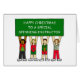 Cuatro personajes de dibujos animados en el desgaste modelado festivo de los deportes, soportando una muestra verde oscuro que dice "felices Navidad a un instructor de giro especial".