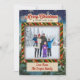 Esta es una tarjeta de Navidad de estilo vintage con un diseño festivo invernal. La tarjeta presenta un fondo azul nevado decorado con copos de nieve y ramas de abeto, con el saludo "¡Feliz Navidad y Feliz Año Nuevo!" que se muestra de manera prominente en la parte superior en una tipografía roja clásica. Una zona central ligeramente hundida está enmarcada por un borde audaz a rayas rojas, doradas y verdes, diseñada para contener una foto familiar. La parte inferior de la tarjeta tiene un banner para personalizar.