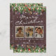 Celebre la temporada navideña con estas tarjetas de Navidad rústicas personalizadas que presentan 3 fotos familiares para ser reemplazadas con las suyas, un fondo de madera oscura, ramas festivas de árbol de Navidad, adornos de árbol rojos y dorados, luces de hadas, su nombre y el año.