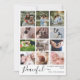 Envía tus deseos personalizados de Navidad a tu familia y amigos mientras muestras algunos de tus momentos favoritos de este año. ¡Y trae "Paz" a tus seres queridos en esta temporada navideña! Esta tarjeta de collage de fotos múltiples de Navidad moderna y minimalista presenta un collage de doce fotos cuadradas y una mezcla de escritura caprichosa moderna y tipografía simple moderna. A continuación, en elegante letra de escritura, está escrito "Pacífico". Abajo, está tu saludo personalizado de vacaciones, el nombre de tu familia y el año. Estas tarjetas se revierten a un mensaje sincero coronado con un pequeño corazón boho. Haz clic en "Personaliza esta plantilla" para editar el texto y subir tus propias fotos. Para modificaciones más avanzadas, simplemente desplázate a "Haz clic para personalizar aún más" y utiliza la herramienta de diseño de Zazzle. ¡Esta tarjeta será un recuerdo favorito durante años! Explora las colecciones anteriores o visita mi tienda para obtener más hermosas tarjetas de fotos navideñas. ¡Te deseo una muy feliz Navidad y lo mejor para el año nuevo!