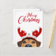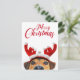 Ilustracion de mascota de animales de la Feliz Navidad con un perro curioso usando una banda de peluquería de renos. Saludo estacional escrito en letras de tipografía moderna.