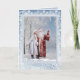 Engendre el navidad (padre ruso Frost) y Snegurochka en un bosque encantado del árbol de abedul de plata de la nieve-coverd. Engendre los puntos del navidad a una estrella… Texto en frente - en ruso: Felices Navidad. Texto dentro en ruso también: ¡Enhorabuena, Felices Navidad! Deseándole felicidad y salud. Deje el amanecer traer un nuevo día. Deje la alegría ligera venir a través de sus ventanas.