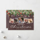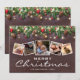 Tarjetas de Navidad elegantes de estilo campestre con fondo de madera oscura rústica, ramas de árbol de Navidad festivas, adornos de árbol rojos y dorados, luces centelleantes, 5 fotos familiares, saludos de temporada, su nombre y el año